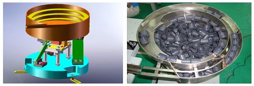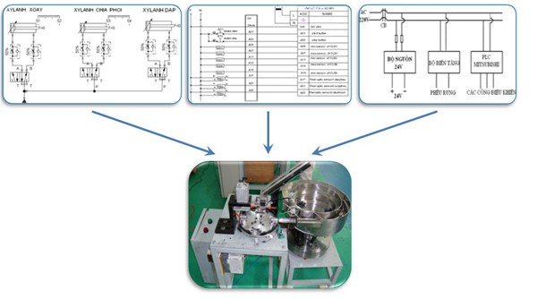 Nguyên lý hoạt động của hệ thống: Trong quá trình cấp liệu người công có thể tùy ý cho chi tiết Cap vào phễu rung một cách tùy ý. Dựa vào chuyển động rung của phễu để lựa đúng chiều nằm xấp của Cap trước khi đưa đến các cơ cấu mâm xoay và dập.