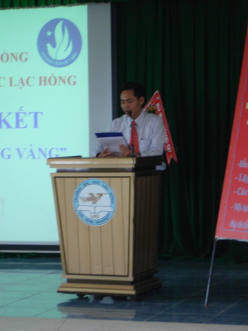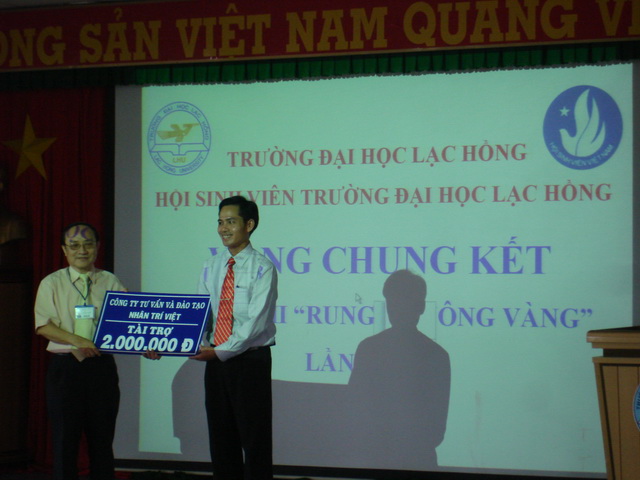 Hình 3: Đ/c Lê Sơn Quang - Chủ tịch Hội SV trường, trưởng BTC cuộc thi nhận tài trợ của Công ty Nhân Trí Việt