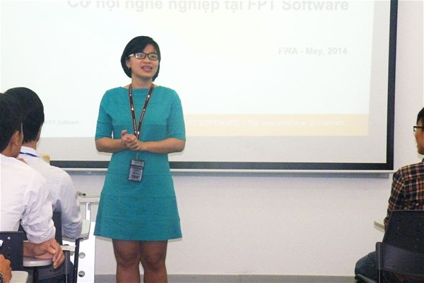 Chị Đào Thị Bích Trâm, nhân viên Phòng nhân sự giới thiệu sơ lược về Công ty FPT Software.