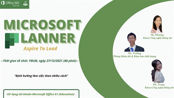 Vào lúc 19h30, ngày 27/12/2021, Khoa Công nghệ thông tin tổ chức buổi: Chia sẻ/hướng dẫn sử dụng ứng Microsoft Planner.