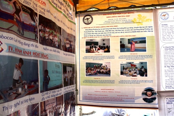 Ngoài buổi tư vấn trực tiếp, các bạn học sinh còn được tìm hiểu kỹ hơn về các trường ĐH, CĐ thông qua những gian hàng trong sân trường ĐH Lạc Hồng. Tại gian hàng của Trường Đại học Lạc Hồng, các bạn học sinh đã được xem các pano, tờ bướm ghi rõ về các khoa, các ngành đào tạo của trường như Khoa Đông Phương học, Khoa Điện - Điện tử, Khoa Công nghệ Hóa và Thực phẩm… Bên cạnh đó, nhiều bạn còn tham gia trò chơi đố vui về thông tin tuyển sinh của trường và nhận được những phần quà xinh xắn từ ban tổ chức.