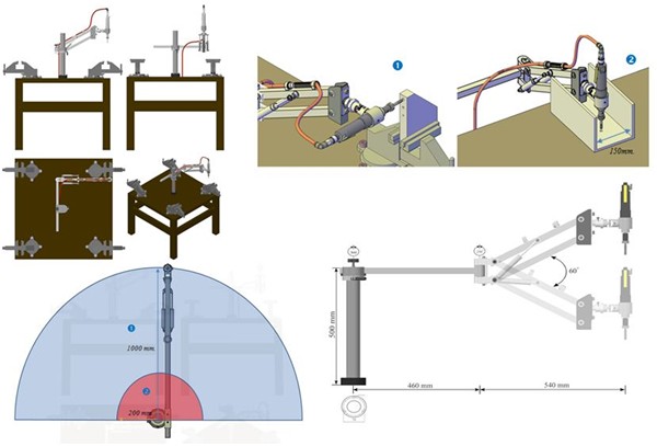 Trong mô hình tổng quan ta thấy máy taro bán tự động được thiết kế sử dụng cho nhiều người ở các vị trí khác nhau và có khả năng làm việc trong phạm vi rộng. Toàn bộ hệ thống được cố định trên mặt bàn. Xung quanh là 4 ê tô để kẹp chi tiết cần gia công
