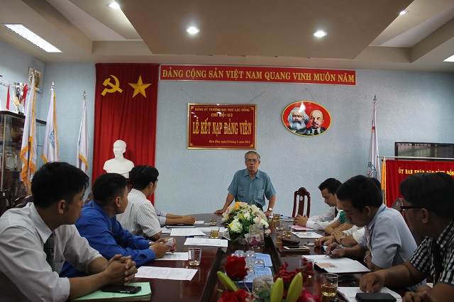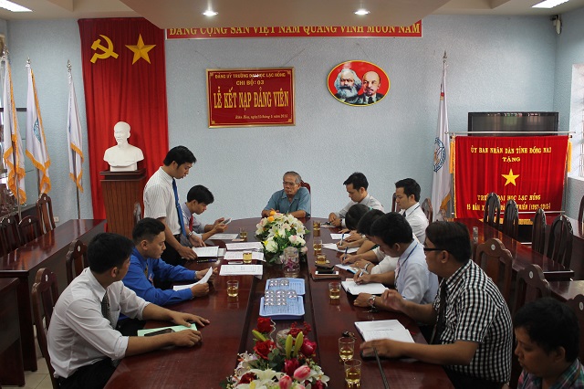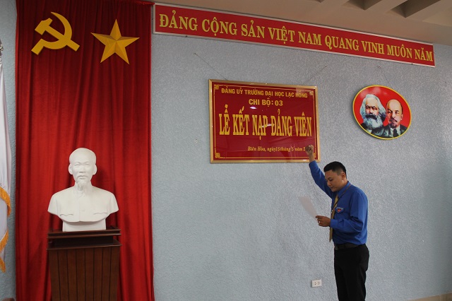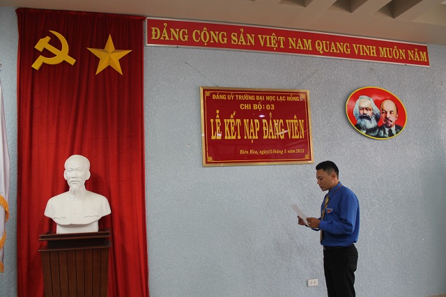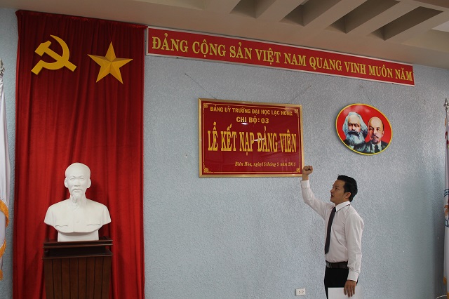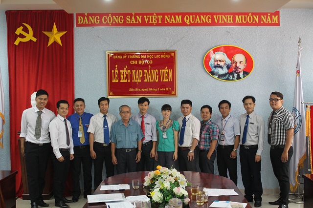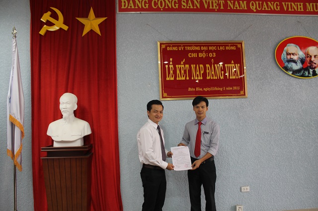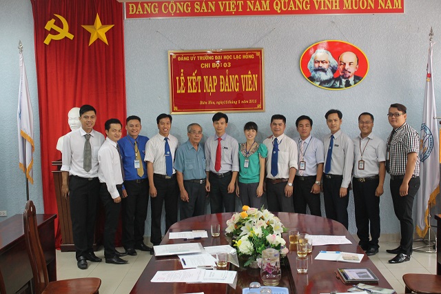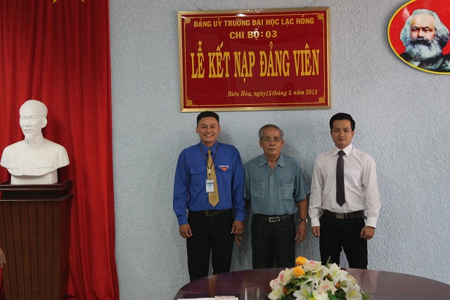 Căn cứ Quyết định của Đảng ủy khối các cơ quan tỉnh về việc kết nạp quần chúng Cao Phan Quang và quần chúng Võ Ngọc Vinh vào Đảng Cộng sản Việt Nam, được sự thống nhất của Ban Thường vụ Đảng ủy Khối các cơ quan tỉnh Đồng Nai, Đảng ủy trường Đại học Lạc Hồng, vào lúc 10h00 ngày 15 tháng 5 năm 2015 tại phòng họp CS1 trường Đại học Lạc Hồng, chi bộ 03 đã tiến hành tổ chức lễ kết nạp đảng viên cho quần chúng Cao Phan Quang và quần chúng Võ Ngọc Vinh vào Đảng Cộng sản Việt Nam; đến dự buổi lễ kết nạp có đồng chí Nguyễn Trùng Phương – Bí thư Đảng ủy trường cùng toàn thể đảng viên trong chi bộ 03.