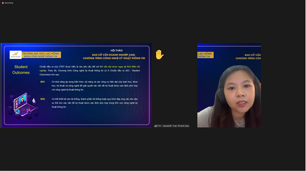 Vào lúc 9h ngày 5.10.2021 Khoa Công nghệ thông tin (CNTT) - Trường Đại học Lạc Hồng tổ chức Hội thảo Ban cố vấn doanh nghiệp (IAB) cho chương trình Công nghệ kỹ thuật thông tin nhằm tổng kết các đóng góp ý kiến của Doanh nghiệp về mục tiêu (PEOs) và chuẩn đầu ra (SOs) chương trình đào tạo của chương trình.