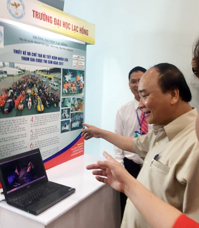 At the ceremony, the Prime Minister visited each booth and encouraged workers who have contributed their innovative products for the society. LHU was honored when the Prime Minister visited and recalled the University's achievements in the field of making robots and fuel-saving vehicles for the past years. In addition, he also encouraged LHU to work harder to continue to achieve high achievements in the contest of creativity, scientific intellect of Vietnam.