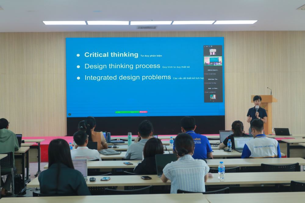 MSc. Van Dinh Vy Phuong, Dean of the Faculty of Information Technology at Lac Hong University, presented on the application of critical thinking and design thinking in integrated design.