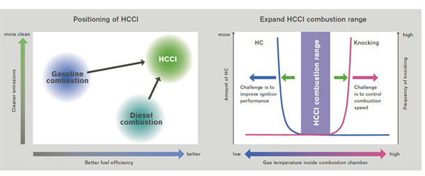 The system features lower-temperature combustion compared to ordinary gasoline engines, resulting in nearly no NOx emissions. It offers the highest potential heat efficiency among internal-combustion engine systems, leading to projections of major cuts in CO2 emissions. Current HCCI technology allows only a limited range of stable combustion, and expanding that is the challenge ahead.