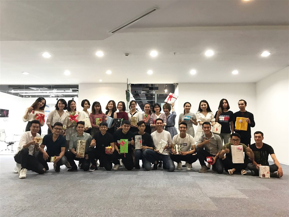 Công Đình cùng đồng nghiệp nhận quà của công ty trao tặng nhân dịp giáng sinh