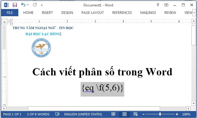 Ví dụ: Phân số 5/6 các bạn nhập EQ \F(5,6).