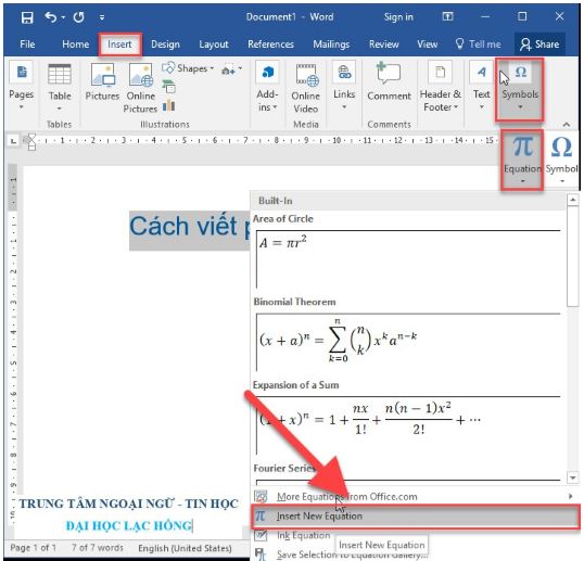 Bước 1: Đặt con trỏ chuột tại vị trí muốn chèn công thức -> vào thẻ Insert -> Symbols -> Equation -> Insert New Equation: