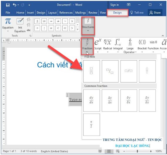 Bước 2: Sau khi chọn xong, vùng nhập công thức toán học hiển thị, bạn kích chọn Design (để lựa chọn định dạng phân số) -> Structures -> trong phần Fraction lựa chọn kiểu phân số bạn muốn hiển thị: