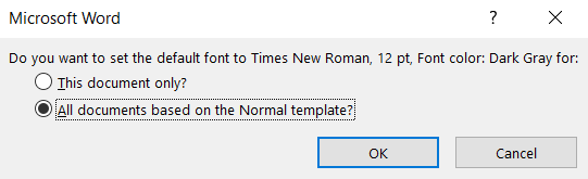 Sau khi bấm vào nút Set As Default, Microsoft Word sẽ xuất hiện 1 hộp thoại yêu cầu chúng ta xác nhận việc thiết lập mặc định này dùng cho trường hợp nào: