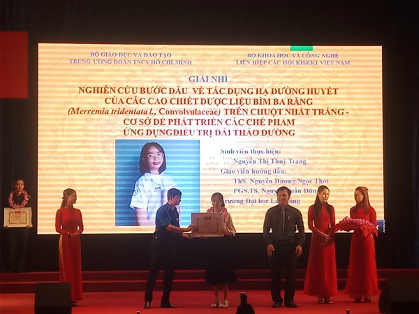On November 27th, 2020, Students Nguyen Thi Thuy Trang from the Faculty of Pharmacy of Lac Hong University recently won the second prize in "Scientific Research Student" Award in 2020  for her project called ‘Hypoglycemic effect of extracts from Merremia tridentata L. Convolvulaceae in mice - basis for developing applied preparations in diabetes treatment.’
